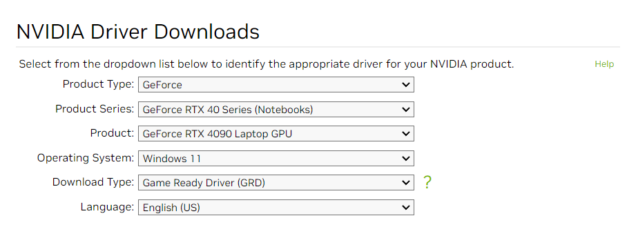 1.BeutazikNvidia hivatalos oldala, és válassza ki a megfelelő lehetőségeket a terméktípusból, a terméksorozatból, a termékből, az operációs rendszerből, a letöltési típusból és a nyelv legördülő menükből a termék azonosításához.