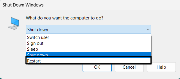 5.Használja aAlt + f4billentyűzet -parancsikon aÁllítsa le az ablakokatablak és válasszonÚjraindíttőle.