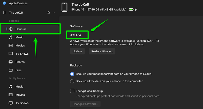 3.Amint az iPhone megjelenik az Apple Devices alkalmazásban, megtehetiEllenőrizze az aktuális iOS verzióta tetején aÁltalánosfül.