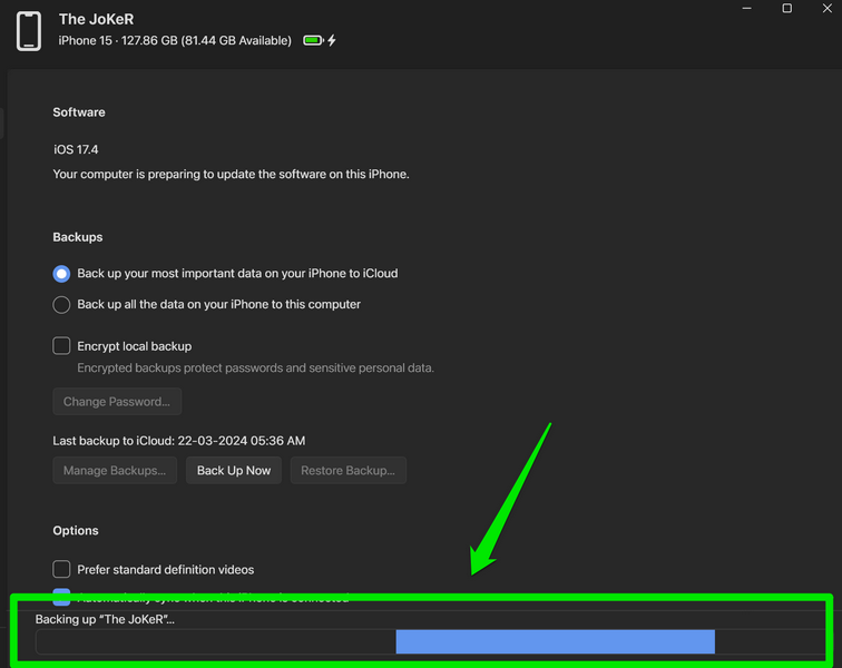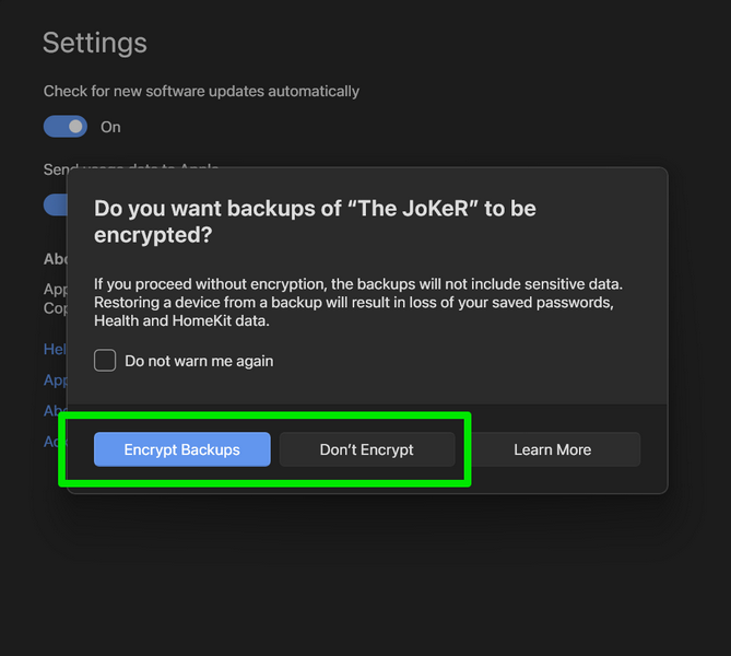 14.A frissítés letöltése után,Az Apple Devices alkalmazás automatikusan létrehozza az iPhone biztonsági másolatátA Windows 11 eszközén. Tehát, az adott prompton,Válassza ki, hogy titkosítja-e (jelszó-védelem) a biztonsági másolatot vagy sem.
