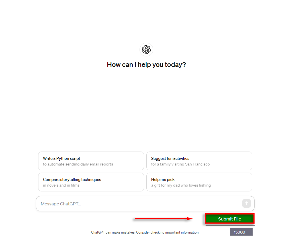 - Töltse be a chatgpt webhelyet, és nyomja meg a gombotFájl küldése- Ez a kiterjesztés által hozzáadott gomb.