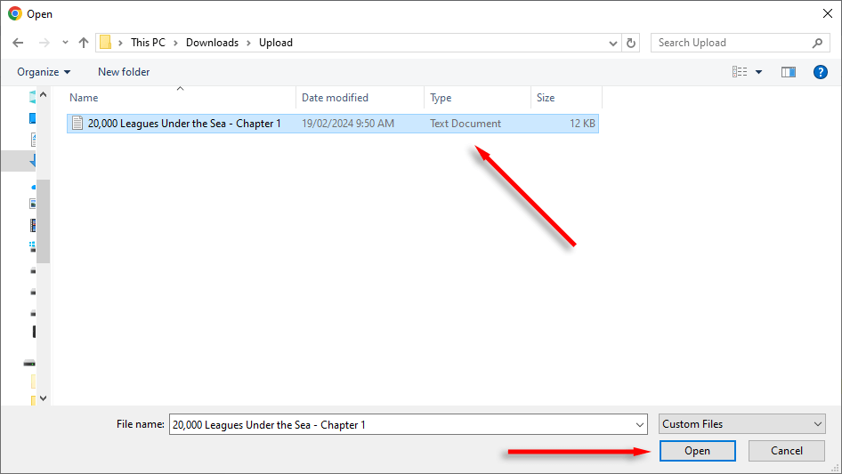 - Válassza ki a feltölteni kívánt dokumentumot. Támogatja a következő kiterjesztéseket: TXT, JS, PY, HTML, CSS, JSON, CSV, MD, TS, TSX, JSX, PDF, DOC, DOCX, XLS, XLSX és ZIP.