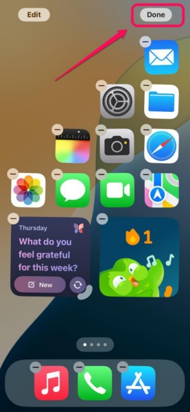 7.Ha elégedett vagy a widget helyzetével, érintse meg aKész gombA jobb felső sarokban, vagy egyszerűen csak csúsztassa fel (vagy nyomja meg a Kezdőlap gombot), hogy kilépjen a Wiggle módból.