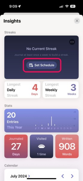 Tehát, ha naponta naplózza a naplóbejegyzéseket, akkor ez megmutatja a Daily Streak -t. Ha azonban egy heti folyóirat -szokást követ, a Streaks widget a heti csíkok számára vált. A Streaks Widget megérintése közvetlenül a Journal alkalmazásban található Insights oldalra jut.