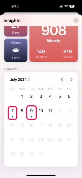 Végül, de talán a legérdekesebb szakasz az Insights oldalon a naptár szakasz. Ez a szakasz biztosítja ainteraktív naptár felhasználói felületdátumokkal, amelyeken készítettélA pontokkal megjelölt naplóbejegyzések- A megadott gombok segítségével navigálhat egy adott hónapra vagy évre, és megérintheti a jelölt dátumok bármelyikét, hogy megmutassa az adott nap minden naplóbejegyzését.