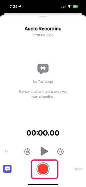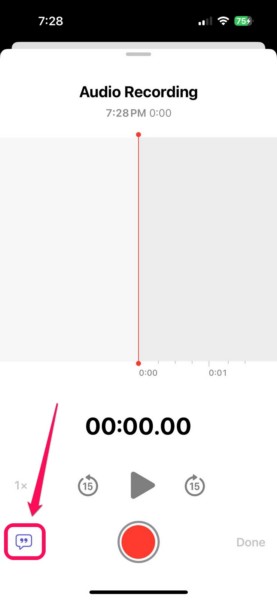 5.A felvétel megkezdése előtt érintse meg aAudio transzkripció (idézet) gombA bal alsó sarokban, hogy megnyissa az audio transzkripció élő nézetét.