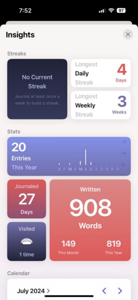 A keresési és válogatási funkciókon kívül az Apple új betekintési oldalt is hozzáadott az iPhone 18-as naplóalkalmazásához az iOS 18-val. Ez az új szakasz mélyreható információk központjaként szolgál a felhasználók naplóbejegyzéseiről és a naplózási szokásokról.
