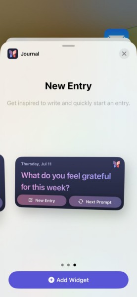 Ha hozzáadjuk az iPhone kezdőképernyőjéhez, az automatikus generált utasításokat mutatja be, hogy ösztönözze új naplóbejegyzéseket. Ezek a utasítások naponta változnak, és a widgeten belüli új belépési gomb segítségével közvetlenül megnyithatja a belépési oldalt a folyóirat alkalmazásban. Ha nem szereti a promptot, akkor a következő prompt gombot is felhasználhatja egy új létrehozásához.