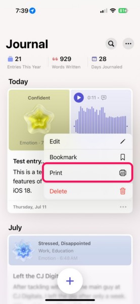 Tehát így működik az új nyomtatási eszköz az iPhone 18 folyóirat -alkalmazásában az iOS 18 -ban.