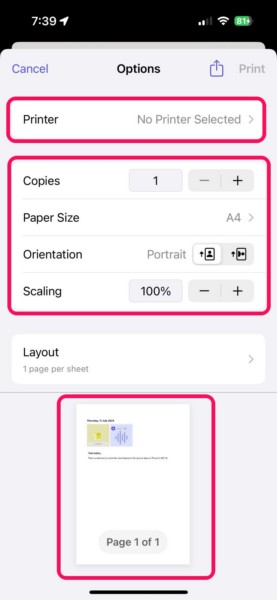 4.A következő oldalon megtehetiVálasszon egy nyomtatót,Testreszabhatja a nyomtatási lehetőségeket, ésLásd a bejegyzés nyomtatási előnézetét-