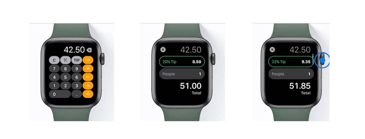 A Calculator alkalmazás minden Apple Watch modellen elérhető, ezért az Apple Watch Series Zero és későbbi felhasználók az alkalmazás segítségével tippeket adhatnak számláikhoz éttermekben, fuvarokon és más helyeken.