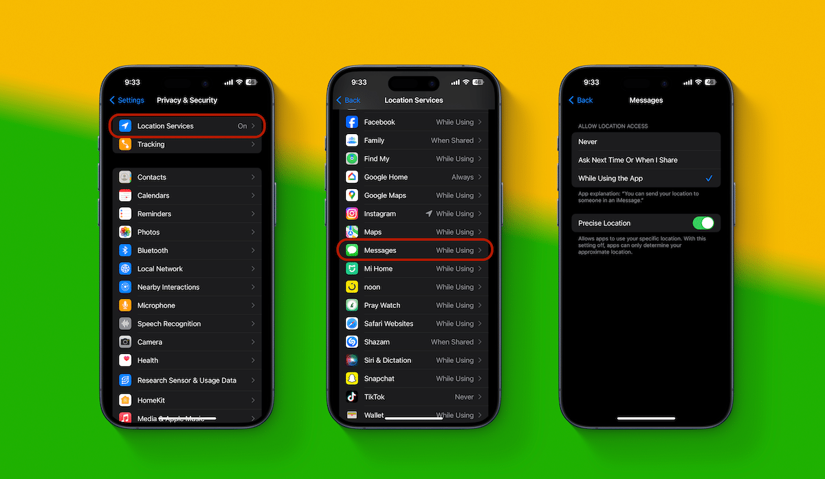 A bejelentkezés használatához a feladónak és a vevőnek az iOS 17 vagy újabb verziókon kell lennie, és bekapcsolnia kell a helymegosztást a Beállítások alkalmazás> Adatvédelem és Biztonság> Helyi Szolgáltatások> Üzenetek segítségével.
