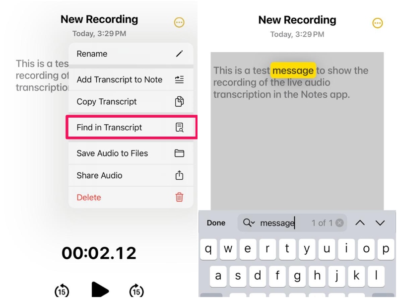 4.Sőt, ha egy adott szót, kifejezést vagy mondatot szeretne megtalálni, az audio -átírásban érintse meg aKeresse meg az átirat opciótésHasználja a keresési eszköztA szavak és kifejezések megtalálása és kiemelése.