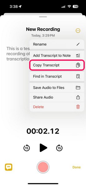 4.Ettől eltekintve te is lehetMásolja a teljes audio -átírásta felvételből aÁtirat másolása opcióA helyi menüben.