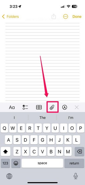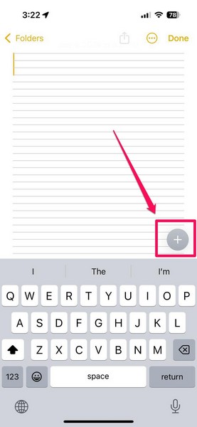 3.A jegyzeten belül,hozza fel a billentyűzetetÉs koppintson a+ gombA menüsor feltárása.