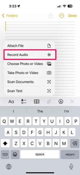 5.A túlcsordulás menüben érintse meg aAudio opció rögzítéseHangfelvétel elindításához a Notes alkalmazásban.