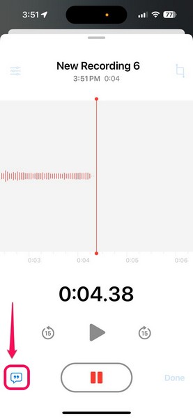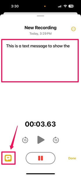 6.Az új felvételi felhasználói felületen koppintson az újraÉlő audio transzkripció (idézet szimbólum) gombA képernyő bal alsó sarkában. Ez felhozni fogSzöveges alapú interfész az audio átírásának bemutatásárahogy valós időben felvételt készít.