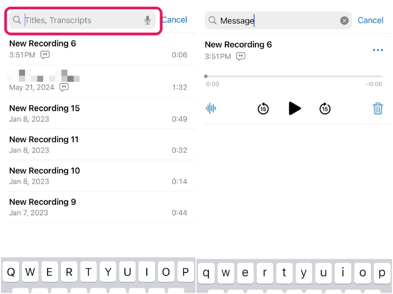 5.Ezenkívül, ha emlékszel egy szóra vagy kifejezésre egy hangjegyzetből, és azt szeretné megtalálni a Voice Memos alkalmazásban, akkor megtehetiHasználja a fenti keresősávotÉs keresse meg a szót vagy kifejezést abban a hangjegyzésben, hogy megtalálja ugyanazt.