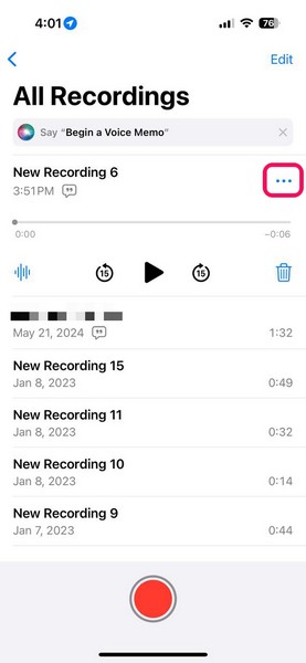 1.A felvételi listán,Keresse meg a hangfelvételtésÉrintse meg a további (három pont) gombotA helyi menü feltárásához.