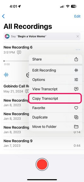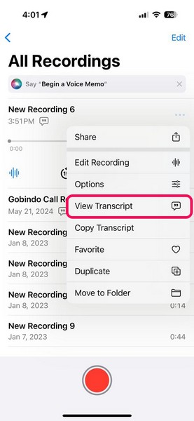 2.Itt érintse meg aTranscript Opció megtekintéseA kiválasztott felvétel audio -átírásának megtekintéséhez.