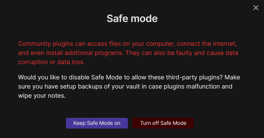 - A rendszer kéri, hogy erősítse meg a választást, és figyelmeztetést kap a rosszul elkészített beépülő modulok kockázataira. Válassza kiKapcsolja ki a Biztonságos módotfolytatni.