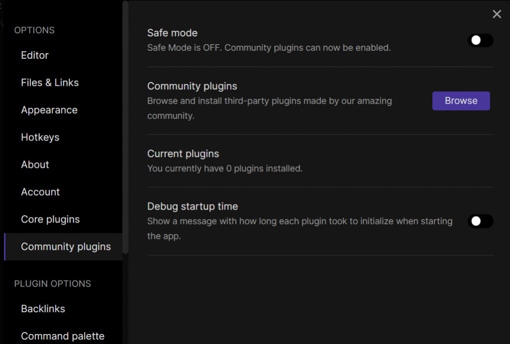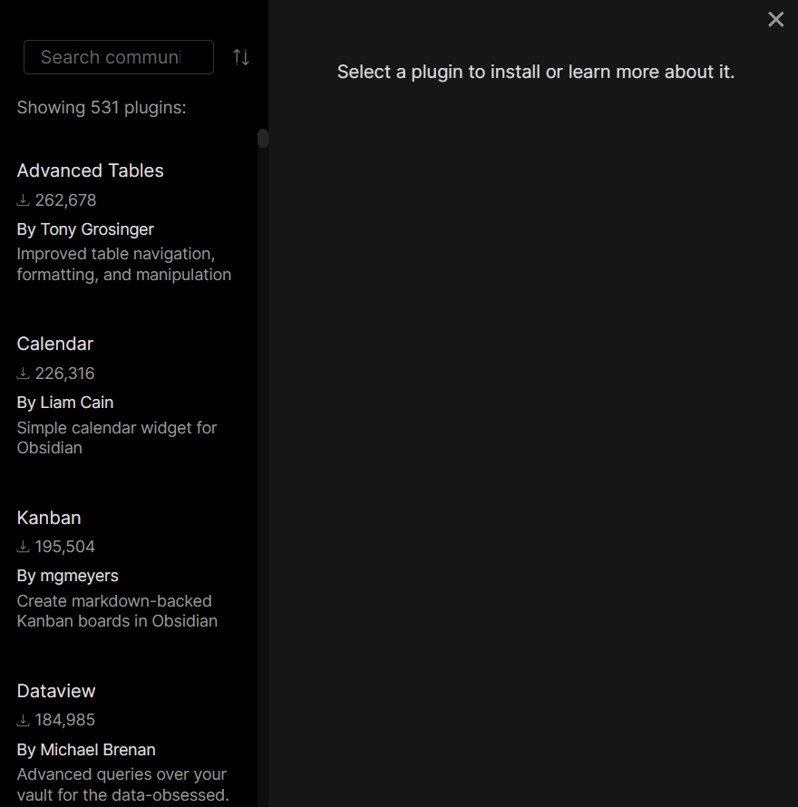 És elég sok plugin is elérhető. Mint minden ingyenes eszköznek, az Obsidiannak is nagy és aktív közössége van. Vannak beépülő modulok, amelyek mindenféle funkcionalitást adnak az Obsidianhoz, így olyan termelékenységi eszközzé válik, mint a Trello vagy a Notion.