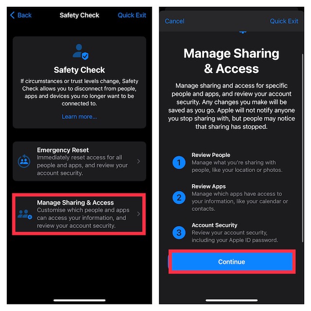 Bármikor úgy érzi, hogy a személyes biztonsága veszélyben van, ki kell használnia a sürgősségi visszaállítási funkciót, hogy gyorsan megóvja az Ön adatait az emberektől és az alkalmazásoktól. Nevezetesen, ez lehetővé teszi az Apple ID jelszavának megváltoztatását és a vészhelyzeti kapcsolatok áttekintését is.