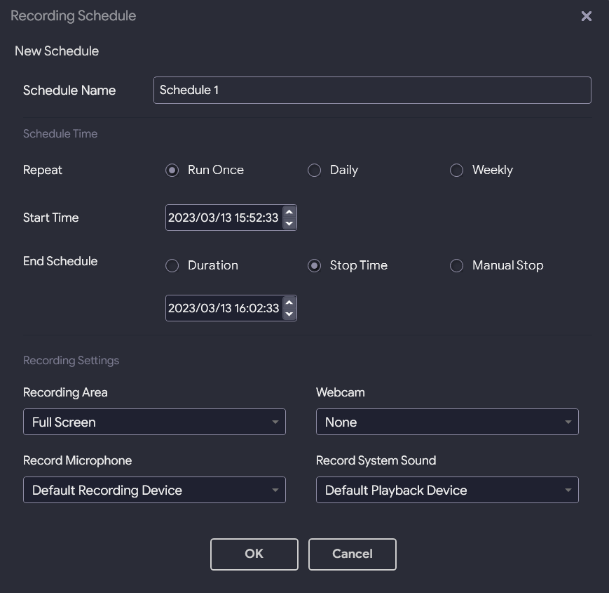 Tanárként valószínűleg több órát is el kell végeznie egy napon. Inkább fárasztó munka lenne, ha az óra elkezdődött, és minden alkalommal manuálisan állítja be a képernyőrögzítést. Mit szólnál ahhoz, hogy ütemezd a felvételeket? A képernyőrögzítő eszköz segítségével ütemezheti a felvételeket oly módon, hogy kiválaszthatja a kezdési és befejezési időpontot, kiválaszthatja a felvételi területet, kiválaszthatja, hogy lefedje-e a webkamerát vagy sem, és még a hangot is kiválaszthatja.