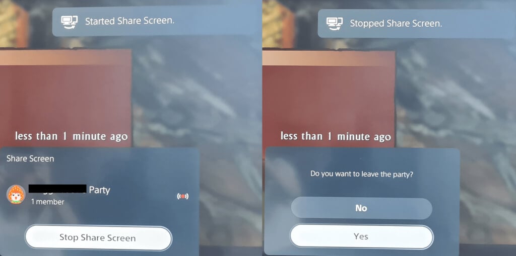 - Látnia kell egy megerősítő üzenetet, amely szerint „Megállított megosztás képernyő”A képernyő jobb felső sarkában. Látni fog egy értesítési ablakot is, amely azt mondja:“El akarja hagyni a partit?”Tehát válassza kiIgenHa befejezte a játékot a barátokkal vagyNemHa csak a képernyő megosztását szeretné végezni, de maradjon a partin.