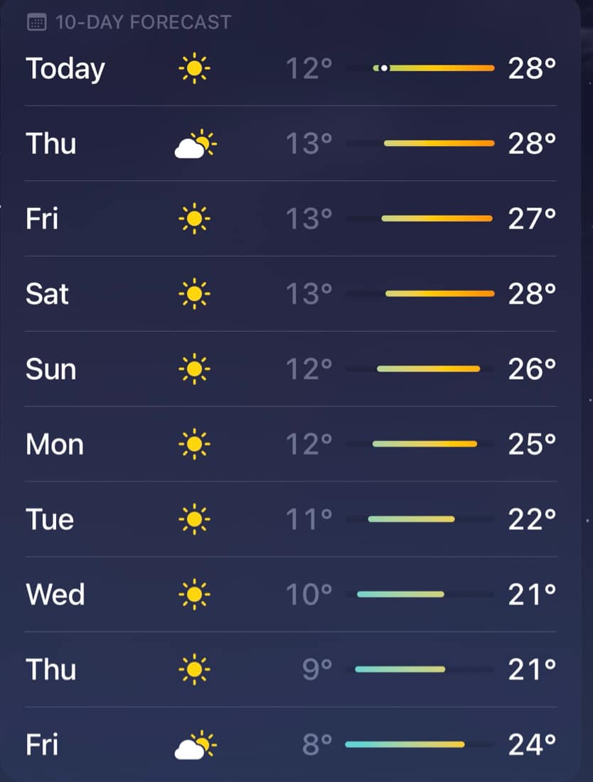 Az Időjárás alkalmazás az iOS 15 frissítésével jelentős tervezési átalakításon esett át. A színes sávok itt jelentek meg először, és ezeknek a sávoknak az a fő célja, hogy több információt jelenítsenek meg egy pillantással. Egyszerűen fogalmazva, a színes sávok a következő 10 nap hőmérsékleti tartományát jelzik.