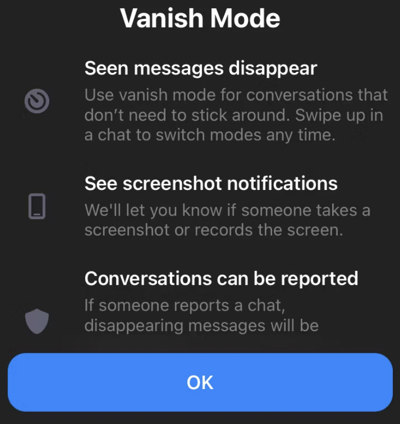 A Vanish Mode a Messenger adatvédelmi funkciója, amelynek célja a Facebook Messenger felhasználói biztonságának és biztonságának növelése. A Someish módban az érzékeny információkat cserélheti anélkül, hogy aggódna, hogy örökre egy Messenger -csevegésben menti. Ehelyett biztos lehet benne, hogy a csevegés bezárása után a SiseSh Mode üzenetek törölnek, és sem a feladó, sem a vevő nem fér hozzá hozzájuk.
