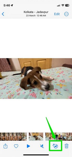 6.Ha a vizuális keresés funkció azonnal felismeri a témát a videóban, akkor láthatja az alsó menüsor i gombját isátalakuljon, hogy ábrázolja az általa észlelt alany típusátA videóban. Például láthatja, hogy az I gomb egy csillogó hatású kutyaikonmá alakult át a videómban (az alábbiakban látható képernyőkép).