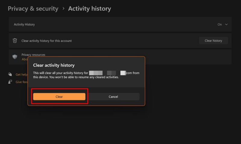 3.A következő oldalon kattintson aTörölje az előzmények törlésétaTisztítsa meg a tevékenység előzményeit ehhez a fiók opcióhozA Windows 11 eszköz meglévő tevékenységi előzményeinek törlése.