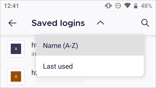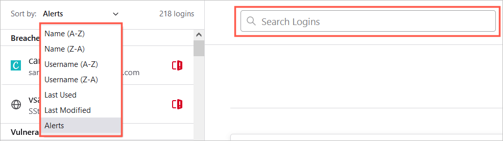 A bal felső sarokban használja a melletti legördülő mezőtElrendezA jelszavak ábécé szerint a webhelynév vagy felhasználónév alapján, utoljára használt vagy módosított, vagy riasztásokkal.