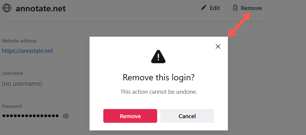 A bejelentkezés eltávolításához, például egy olyan webhelyen, amelyet már nem látogat meg, válassza ki a bal oldali listában, és válassza kiEltávolításjobb oldalon. Erősítse meg a törlést a kiválasztássalEltávolításMég egyszer.