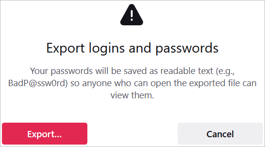 - Megjelenik egy felszólítás, hogy a bejelentkezési részletek olvasható formátumban lesznek. Ezt szem előtt kell tartani attól függően, hogy mit tervez a fájlhoz. A folytatáshoz válassza kiExport-