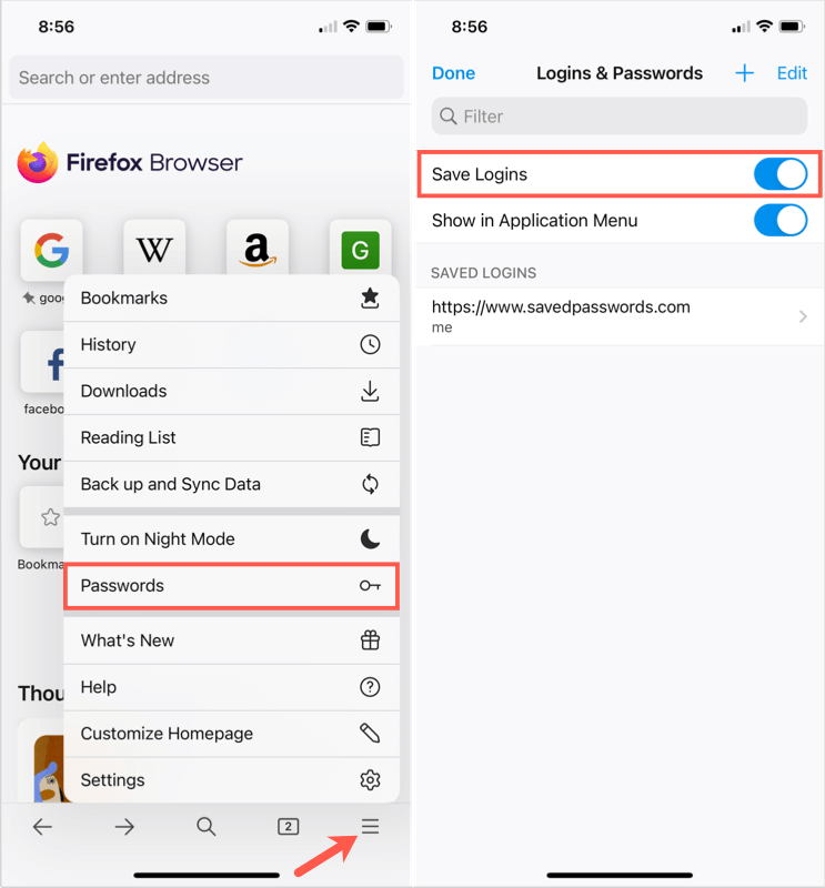 Az iPhone -on érintse meg aMenügomb a Firefoxban és válassza kiJelszavak- Kapcsolja be a kapcsolótMentés bejelentkezés-