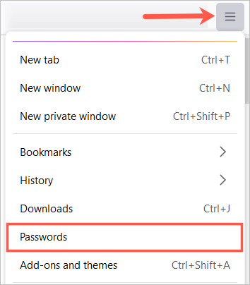- Nyissa meg a Firefox menüt a jobb felső sarokban, és válassza kiJelszavak-