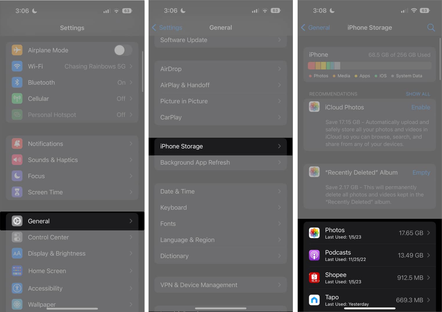 Annak biztosítása érdekében, hogy az alkalmazásnak elegendő hely legyen a megfelelő futtatáshoz, lépjen az eszközhözBeállítások → Általános → iPhone tárolás- Érintse meg az egyes alkalmazásokat, hogy ellenőrizze, hogy mennyi tárolót használt, majd törölve törölje a felesleges alkalmazásokatKiküldetési alkalmazáshogy szabadítson fel egy kis helyet.
