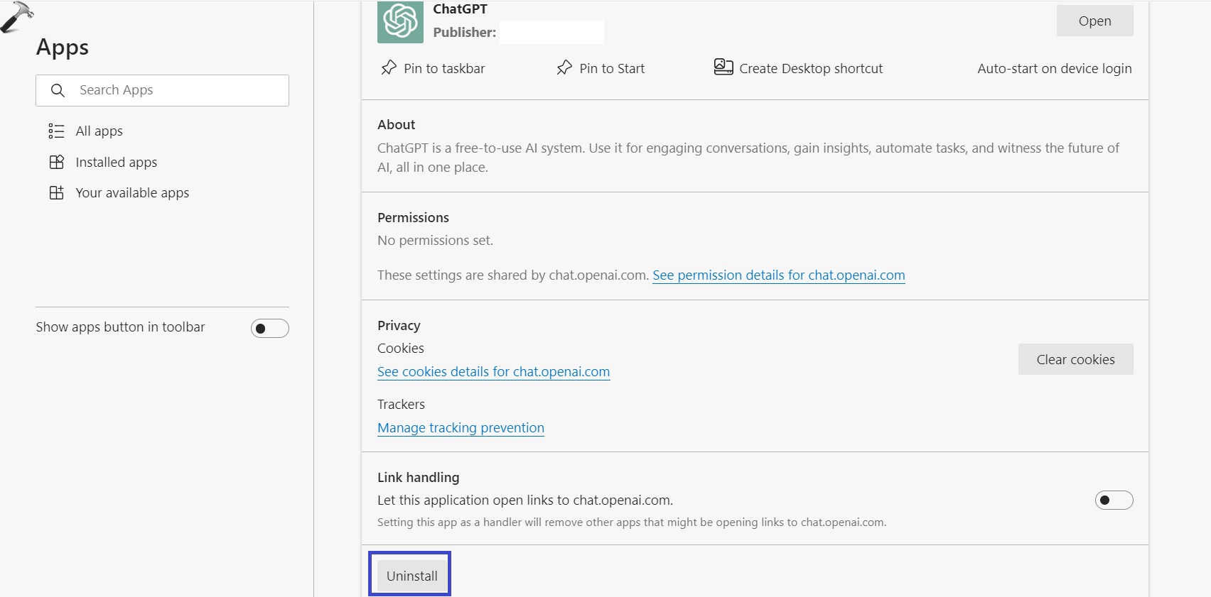 3. Kattintson a „Eltávolítás” gombot a ChatGPT alkalmazás eltávolításához.
