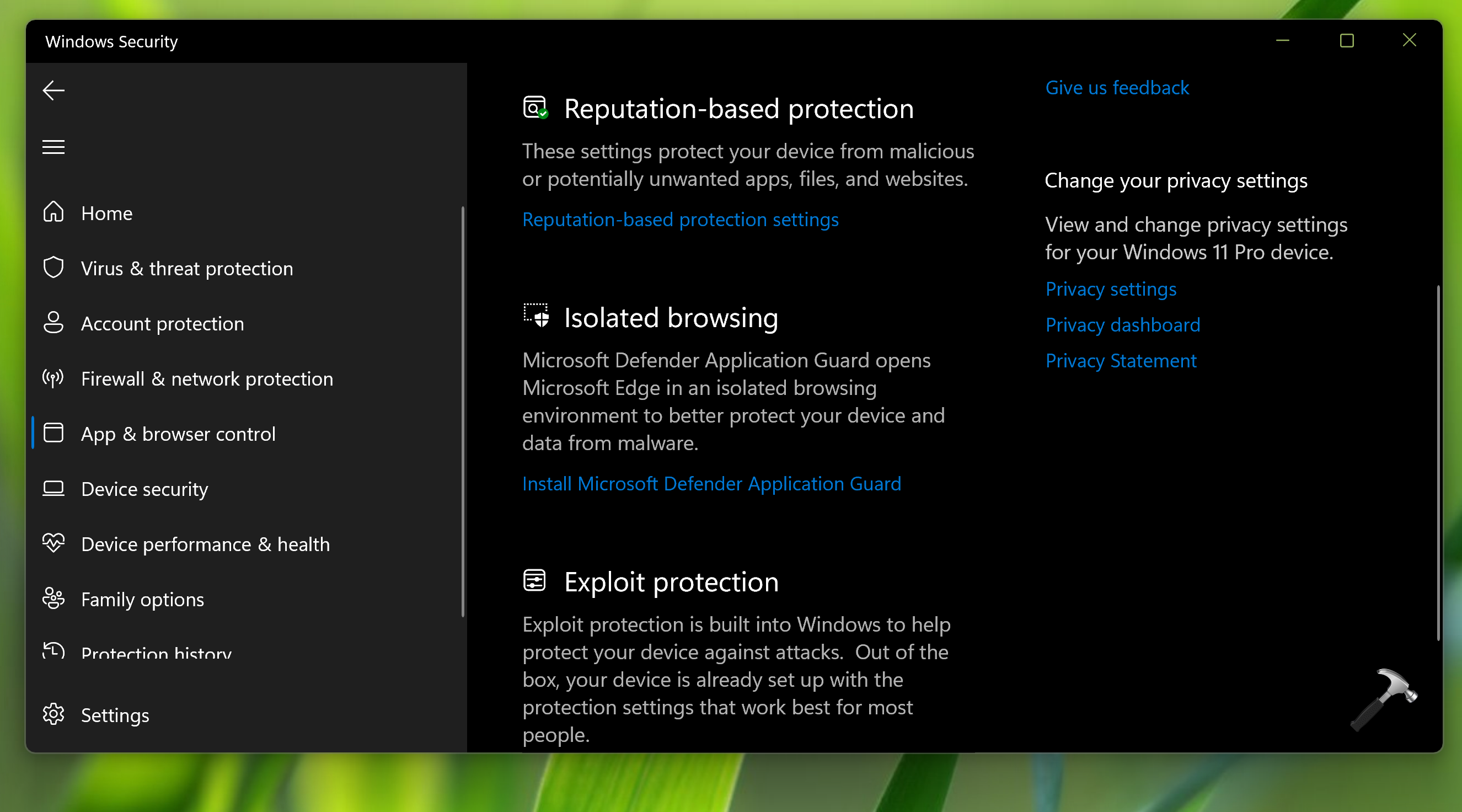 A Windows Security segítségével a Microsoft Defender Alkalmazási Guard engedélyezéséhez vagy telepítéséhez is használható.
