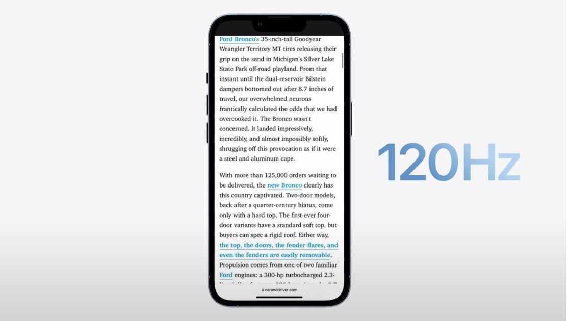 Jelenleg az iPhone 13 Pro és a Pro Max az egyetlen iPhone, amelynek LTPO OLED kijelzői lehetővé teszik számukra, hogy 120 Hz -re növeljék a frissítési sebességüket. Ugyanakkor akár 10 Hz -re is le tudnak lépni, a képernyőn megjelenő tartalomtól függően. Noha ez elősegíti az energia és az akkumulátor élettartama hosszú élettartamának megőrzését, egyes versengő okostelefonok olyan megjelenítéseket mutatnak, amelyek szükség esetén 1 Hz -re csökkenhetnek.