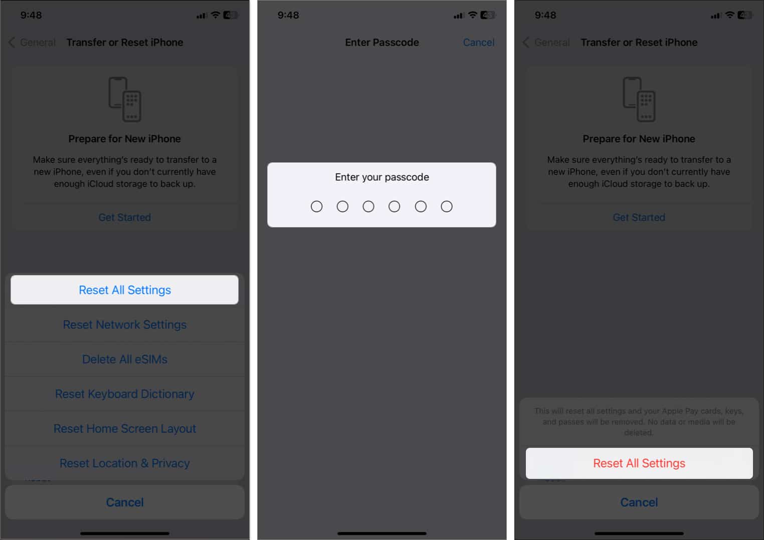 Az iPhone beállításainak visszaállításához nyissa megBeállítások- Akkor menj elÁltalános→Az iPhone átvitele vagy visszaállítása→Visszaállít→Az összes beállítás visszaállítása- Most írja be az iPhone jelszavát, és koppintsonAz összes beállítás visszaállításaA választás megerősítéséhez.