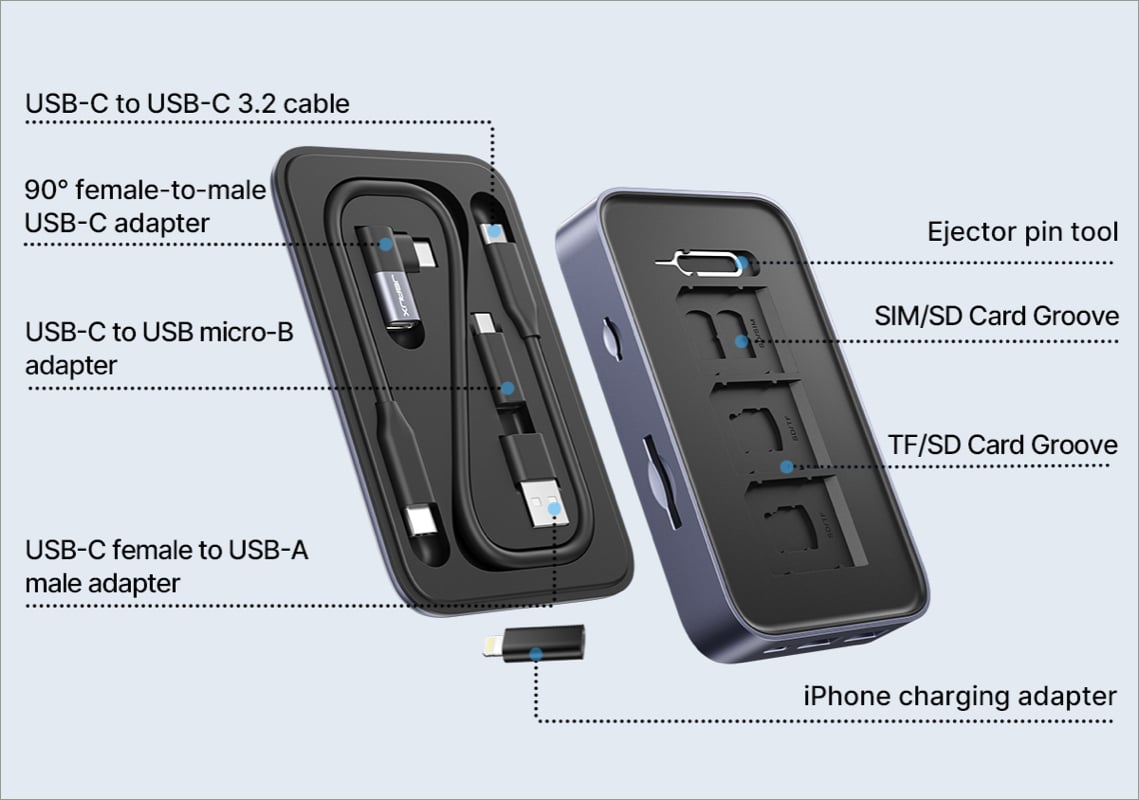 A csomaghoz tartoznak, de ezekkel együtt SIM-kártyákat, SD-kártyákat és TF-kártyákat is tárolhatunk. Minden tökéletesen illeszkedik a megfelelő barázdákba, így nem kell aggódnia az illeszkedés miatt.