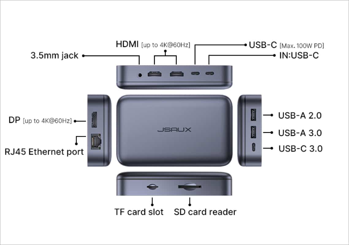 12 portot kap, amelyek jól jöhetnek, amikor a munkája megköveteli. A két HDMI port és a Display port legjobb része az, hogy 4K felbontást biztosítanak 60 Hz-en. Ezenkívül az USB-C kimenet 100 W-os PD töltést kínál. Nem könnyű megtalálni ezt a sok portot egy dokkolóállomáson, amely rendszerezőként is működik.
