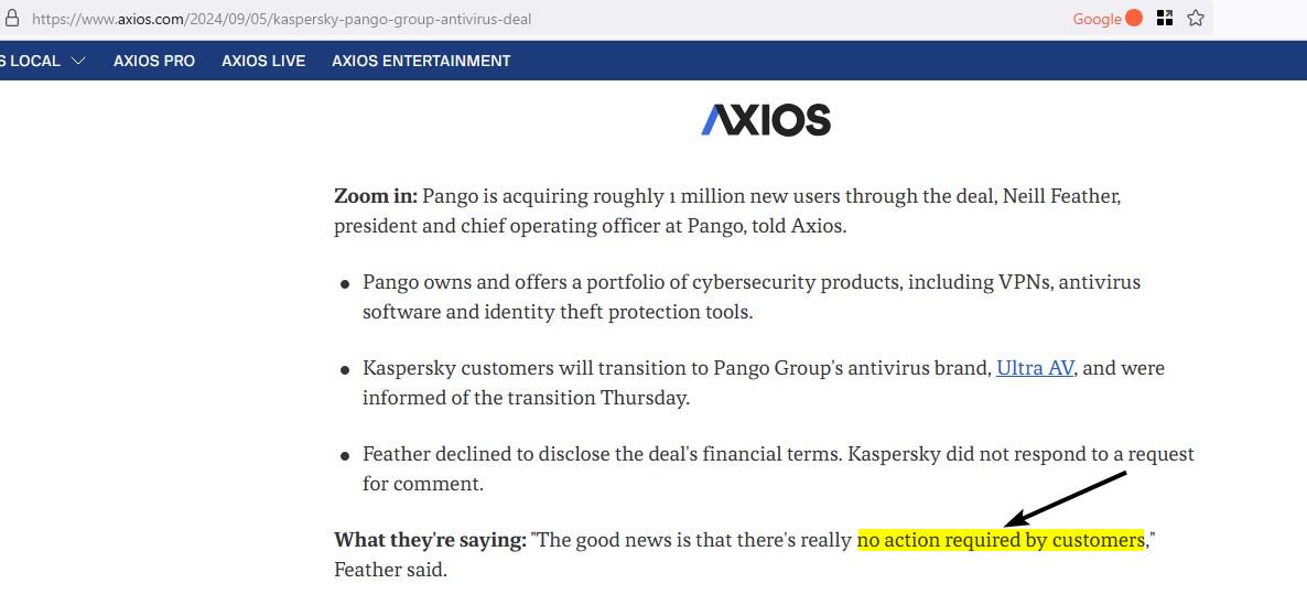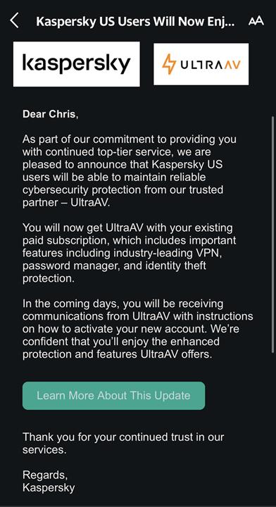 Kiderült, hogy megtették,Axios2 hete írt erről. A felhasználókat e-mailben értesítették a Kaspersky-ről az UltraAV-ra való átállásról. De néhány felhasználó azt mondja, hogy voltaksoha nem tájékoztattáka szoftver telepítése előtt.