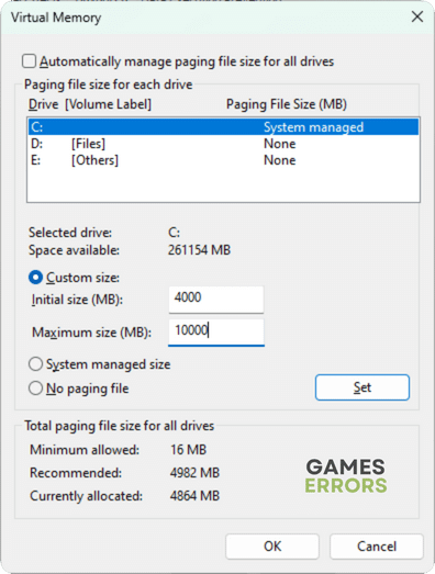 - Uncogd a mellette lévő doboztAz összes meghajtó számára automatikusan kezelje a lapozófájl méretétÉs akkor jelölje beEgyedi méret-