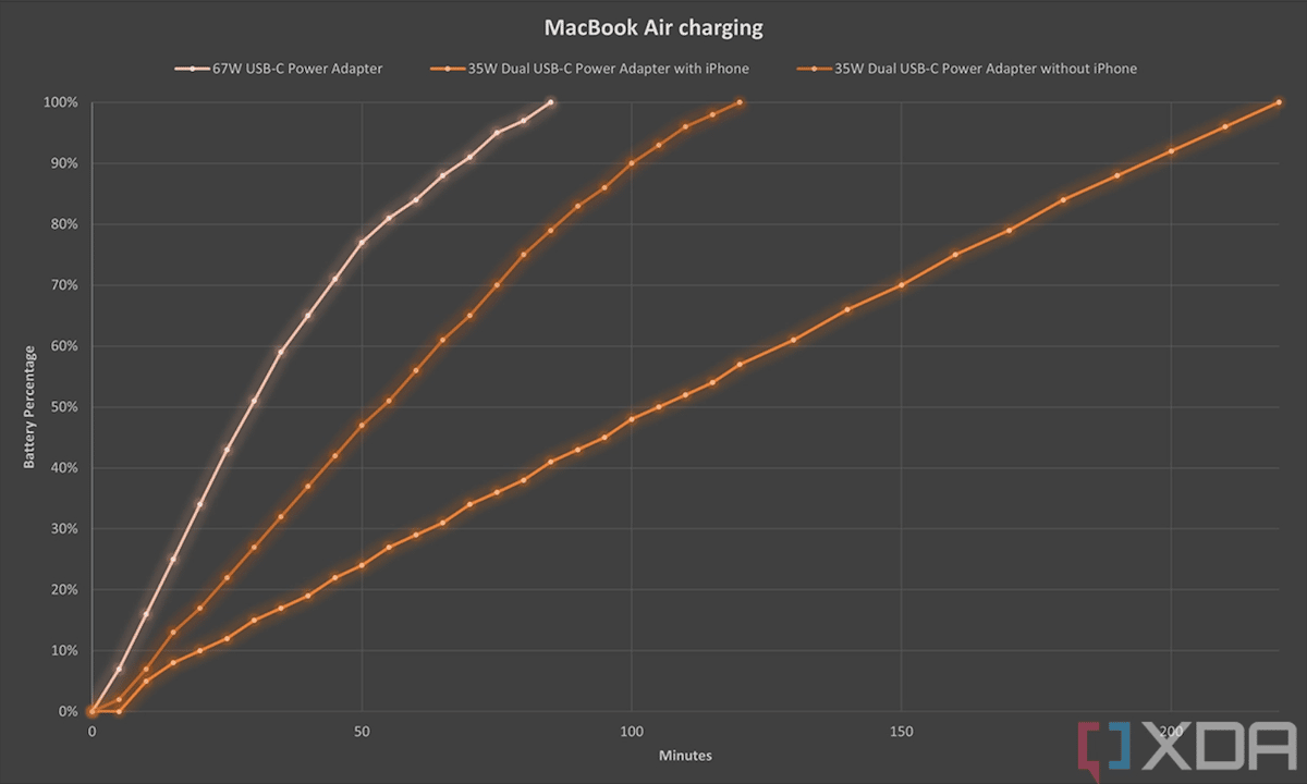 A 67W -os adapter teljesítménytégla 85 perc alatt feltöltötte az M2 MacBook Air -t. Másrészt a 35W -os kettős teljesítményű adapter 220 percet vett igénybe a notebook feltöltéséhez, amikor csatlakozik egy iPhone 13 Pro -hoz és 120 perchez, anélkül, hogy egy másik eszköz csatlakoztatta volna a dugót.