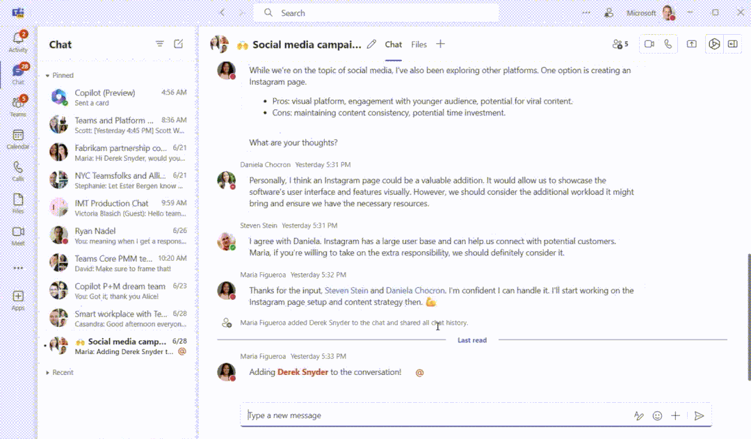 - Csevegés összefoglalása: A Copilot összefoglalókat generálhat a csevegési beszélgetésekről, kiemelve a fő pontokat és az akcióelemeket. Ez segíthet a felhasználóknak gyorsan felzárkózni a beszélgetésbe, vagy egyértelmű áttekintést kaphat a megvitatott dolgokról.