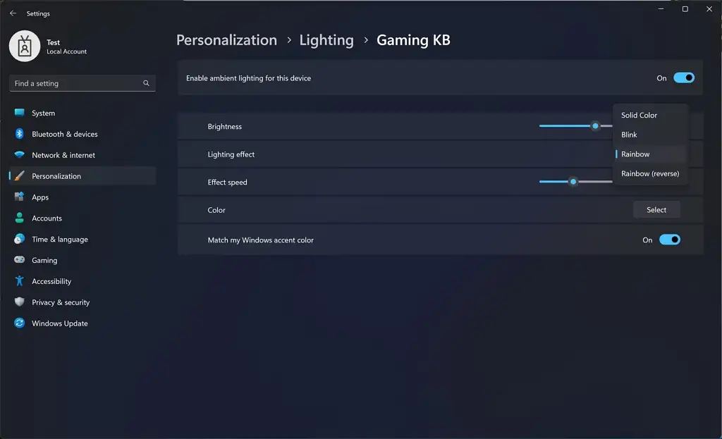 Ezenkívül a Microsoft azt mondja, hogy a fejlesztési csapat egy „Dynamic Lighting” néven ismert új funkción dolgozik. A Dynamic Lighting egy új szolgáltatás, amely lehetővé teszi a felhasználók számára, hogy az RGB megvilágítását az eszközökön irányítsák. A szolgáltatást úgy tervezték, hogy megkönnyítse a világítás testreszabását és szinkronizálását a különböző eszközökön, és felhasználható különféle effektusok létrehozására, például a lámpák időben történő pulzálása a zenével vagy a színek megváltoztatására a képernyő tartalma alapján.